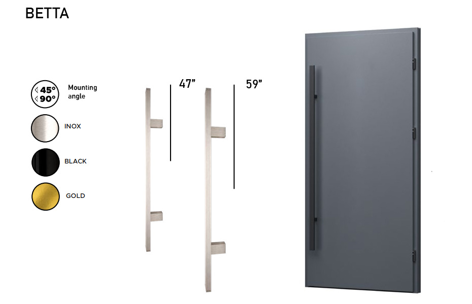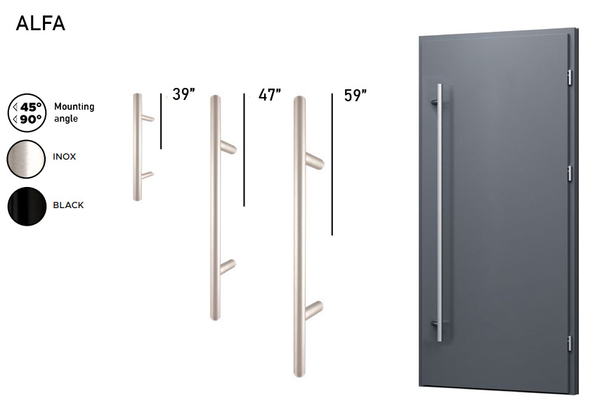 Standard option. Long pull handle from one side and regular door lever from the other side.