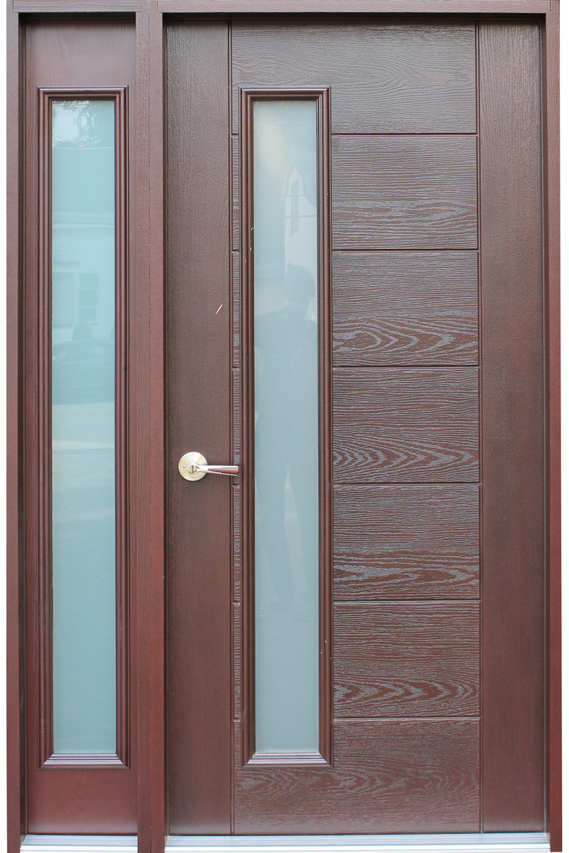 Mahogany Woodgrain Fiberglass Door Pre-Finished. The Mahogany Woodgrain Texture is patterned off a true wood door design to give the door the warmth and feel of wood with the long lasting benefits of fiberglass This door is True Elegance. This door offers an elegant Center Glass Design with a high definition embossment and rich detail. Single Door Spec: 36 in. x 80 in. Prehung Door, 5 1/4 in. jamb, Fits Rough Opening of 38-1/2 in. x 81-1/8 in. Sidelite width 13in.